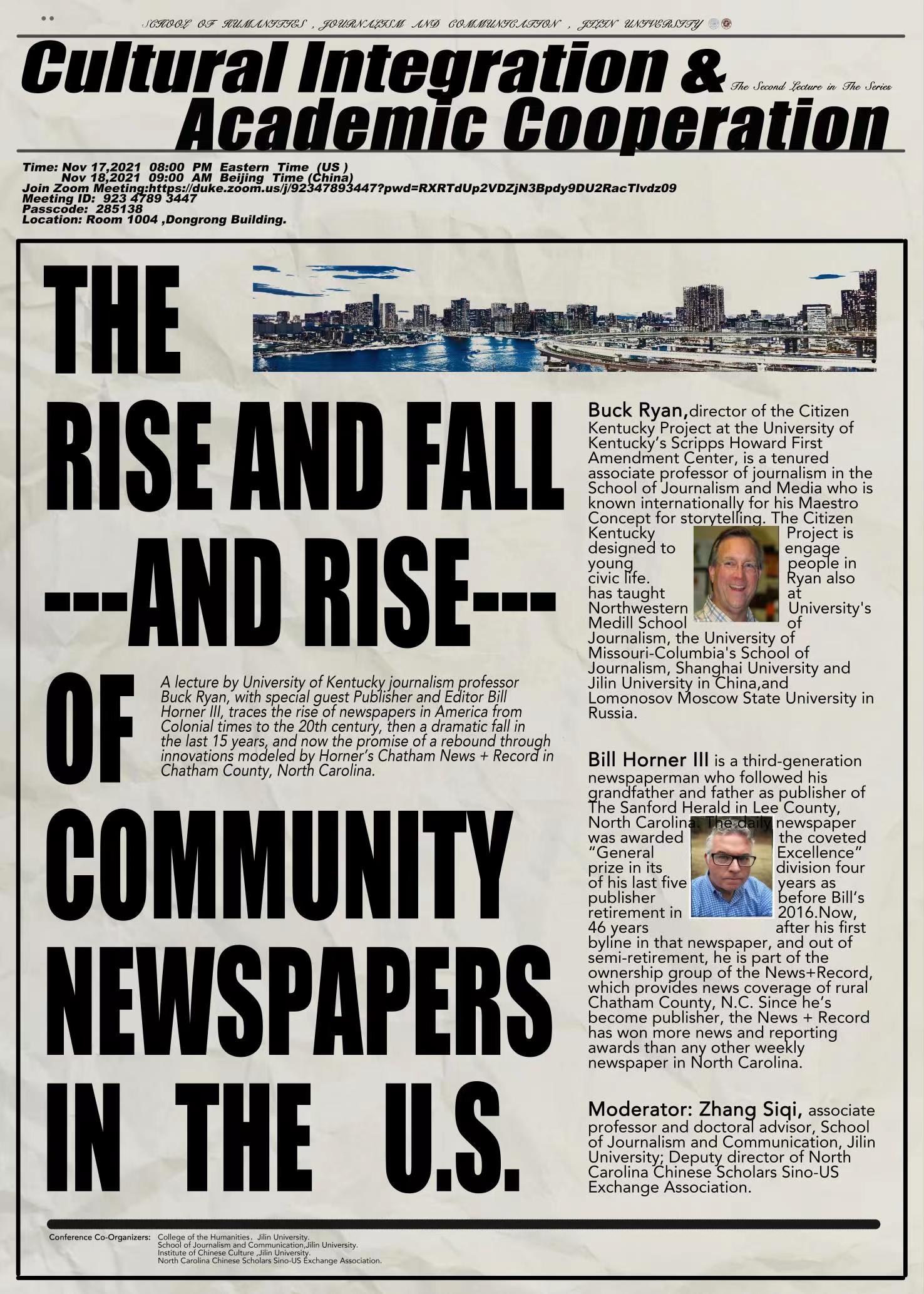主讲人简介:巴克•瑞恩教授是肯塔基大学“斯克里普斯霍华德第一修正案中心”的“肯塔基公民”项目主任,是新闻与媒体学院的副教授。他因其讲故事的“大师概念”而闻名世界。瑞安教授还曾任教于西北大学梅迪尔新闻学院、密苏里堪萨斯大学哥伦比亚新闻学院、中国的上海大学和4K影视