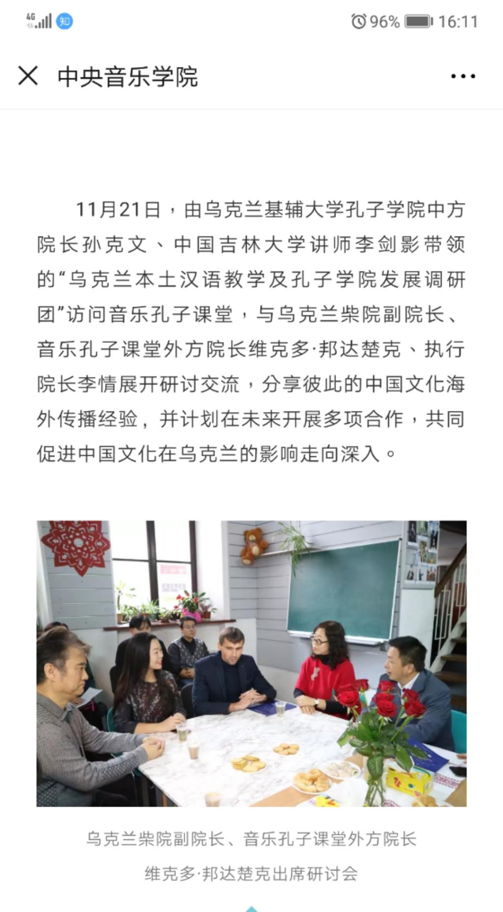11月21日,李剑影老师及团队应邀赴柴可夫斯基音乐学院进行音乐孔子课堂现状的考察,与音乐孔子课堂外方院长维克多·邦达楚克、执行院长李情展开交流研讨,分享彼此的中国文化海外传播经验,并计划在未来开展多项合作。柴可夫斯基音乐学院和国内合作院校——中央音乐学院的微信公众平台对此次考察进行了相关报道。柴可夫斯基音乐学院孔子课堂是欧洲境内首个“音乐孔子课堂”,先后在“中乌友谊音乐会盛典”“中乌音乐对话”“中国音乐进校园”“孔院发展研讨会”等活动中展示传播中国音乐文化,受到乌克兰民众的热烈欢迎。