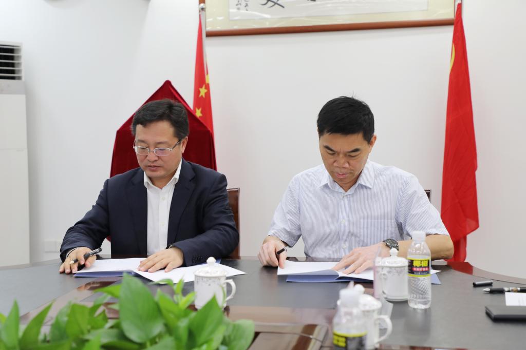 党委书记康永刚(左)同海南广播电视总台副台长王坤(右)签署合作协议。