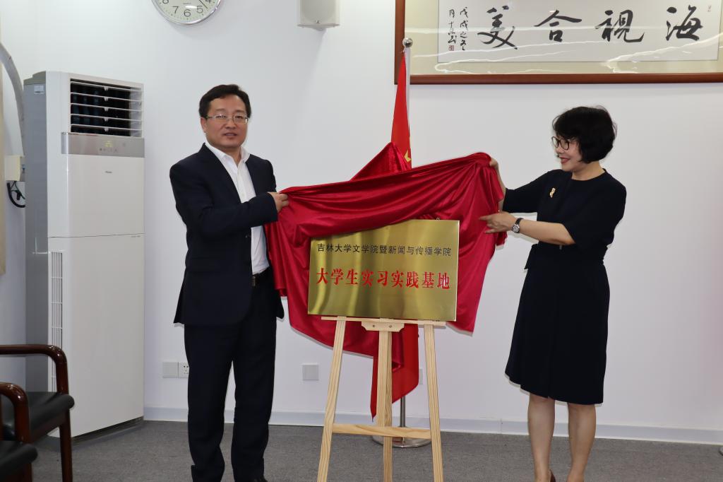 党委书记康永刚(左)、海南广播电视总台总编辑尹婕妤(右)共同为“大学生实习实践基地”揭牌。