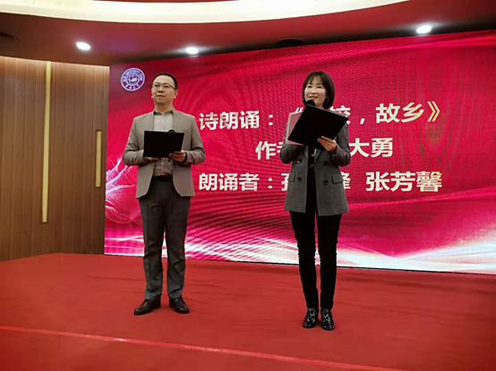 校友、安徽师范大学教师孙炜峰主持,孙炜峰和广电系副主任张芳馨共同朗诵马大勇教授创作的诗歌《母校,故乡》。