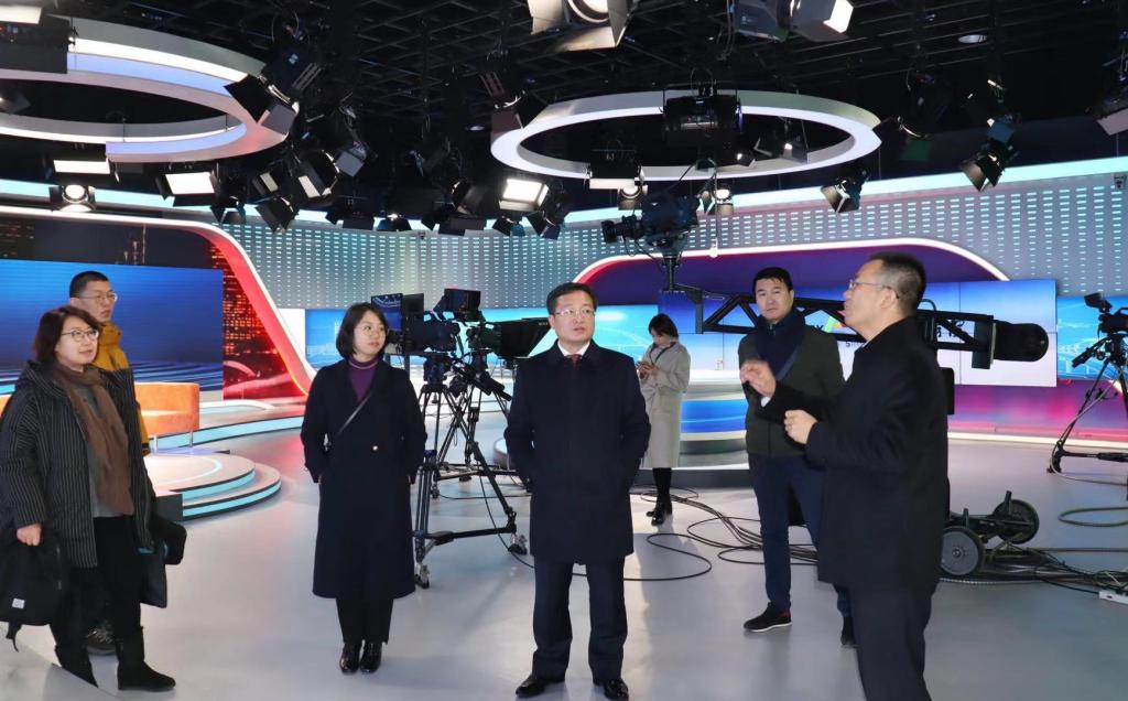 图7:在山西传媒学院副校长郭卫东教授(右一)的陪同下,康永刚书记一行参观山西传媒学院演播大厅。