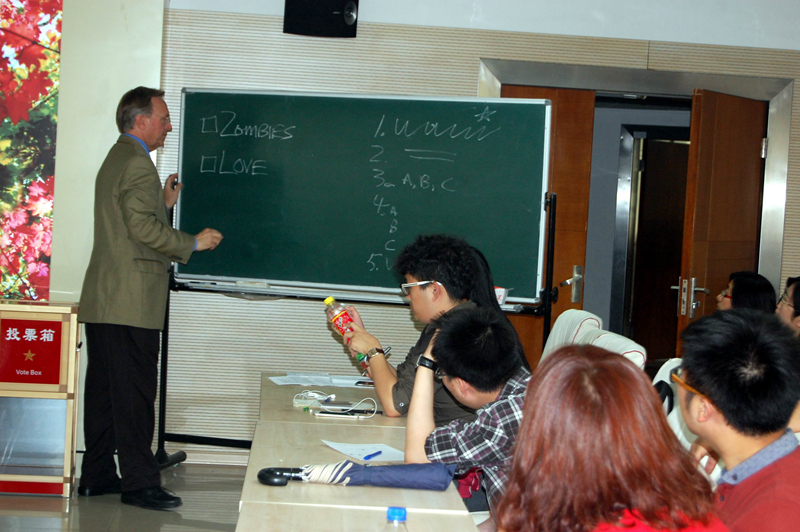 一名硕士研究生在肯塔基大学交流学习过程中对美国社会及文化认识的变化,然后布克•莱恩先生通过圣帕特里克节讲解了中美文化的差异,在圣帕特里克节这一天如果有人戴绿帽子,这是很正常的,但在中国“绿帽子”却有着其他的含义。讲座中还播放了“大师理念”(Maestro Concept)录像片断。在互动环节,布克•莱恩先生给出一个关键词,设定一个主题情景,将听讲师生分成小组,让每个小组为主题情景编写一段小故事,如Zombies(僵尸)、Love(爱)、Funeral(葬礼)等,听讲师生都积极地参与并踊跃发言,讲述自己小组创作的小故事,故事或新奇搞笑,或跌宕起伏,现场气氛十分活跃。通过互动,使师生了解到如何充分理解中美两国之间的文化差异,更好地讲好故事、做好有效传播的工作要领。