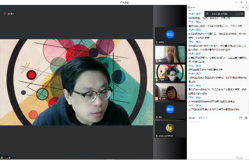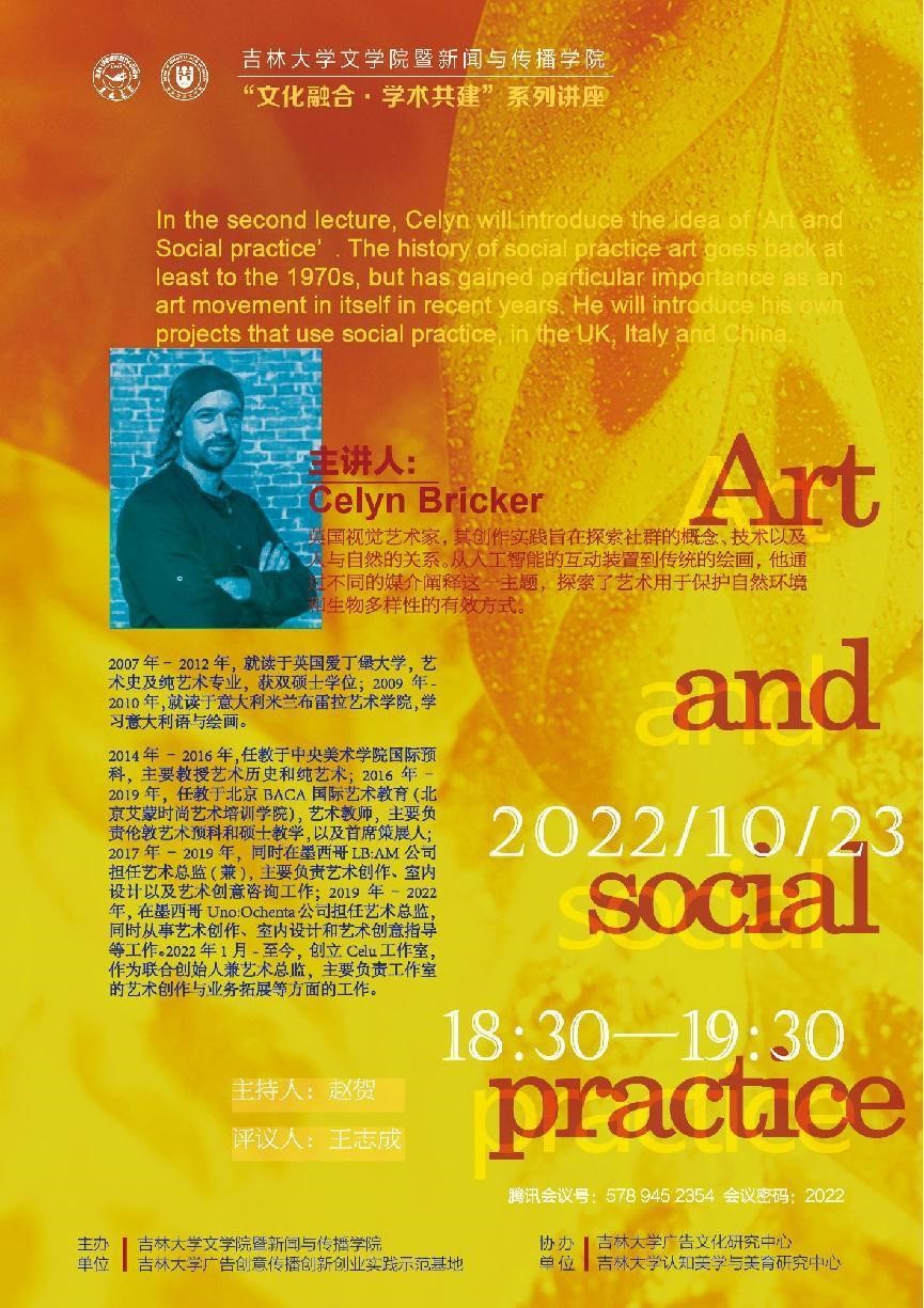 认知美学与美育研究中心协办了第二期主题为“艺术和社会实践”的“文化融合·学术共建’’的英文学术讲座。本次讲座以线上形式进行,由传播系国际传播教研室主任赵贺副教授主持,创意传播设计教研室主任王志成老师评议。相关专业老师、在读本科生及硕士研究生共九十余人参与了此次活动。本期仍由英国视觉艺术家Celyn Bricker主讲。
