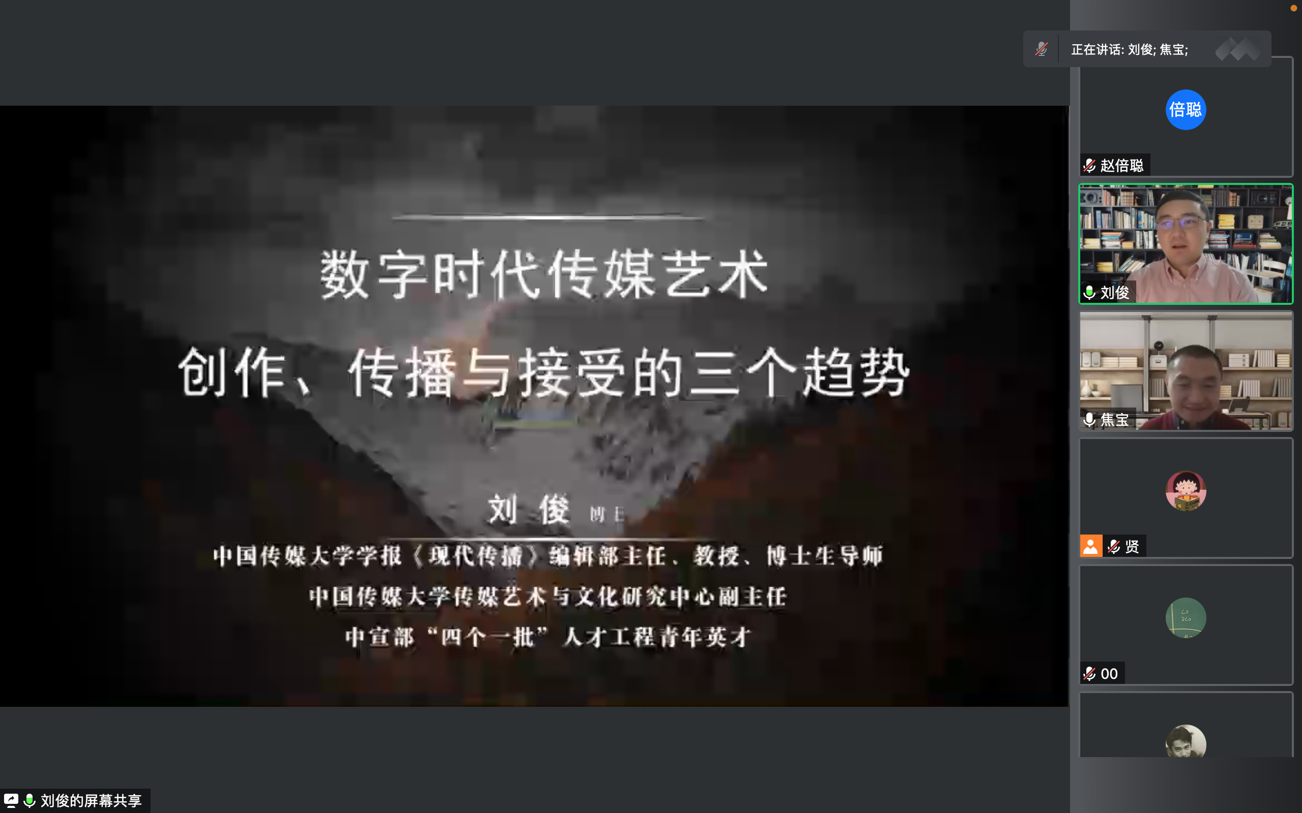 暨新闻与传播学院、“新闻传播+”研究生学科交叉融合学术交流分中心以线上讲座的形式,特邀中国传媒大学教授、博士生导师刘俊。以“数字时代传媒艺术创作、传播与接受的三个趋势”为题,为各专业研究生进行了深入讲解,推动了各学科间的相互交流。新闻与传播学院焦宝老师、姜明老师参与本次讲座。新闻传播学、马克思主义理论、文学、史学、管理学、考古学等专业同学聆听本次讲座。