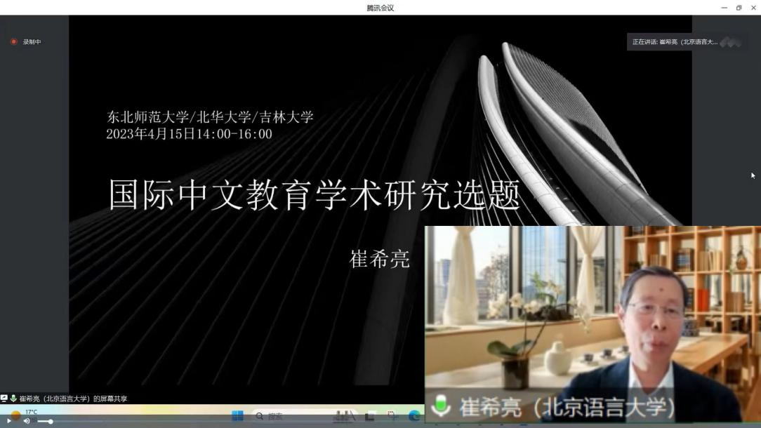 联动东北师范大学国际汉学院、北华大学国际教育交流学院,邀请北京语言大学语言学与应用语言学教授、中国书法国际传播研究院院长、世界汉语教学学会副会长、北京语言大学原校长崔希亮教授,做了题为“国际中文教育学术研究选题”的线上讲座。崔教授的研究视野广阔,兼具高度与深度,不仅关注语言理论,同时也关注语言教育,尤其在国际中文教育领域具有独到的见解。讲座从国际中文教育所面临的现实问题出发,梳理了基础研究和应用研究发展的阶段历程与重要意义;详细阐述了宏观、中观、微观三个层次的研究内容与研究方法,并提供了切实可行的示例,如:宏观层面的国际中文教育发展策略研究、中观层面的国际中文教育学科建设研究、微观层面的课堂教学研究等。崔教授的讲座高屋建瓴、深入浅出,开阔了学院师生的学术研究视野,拓宽了科研新思路,与会师生均表示受益良多。