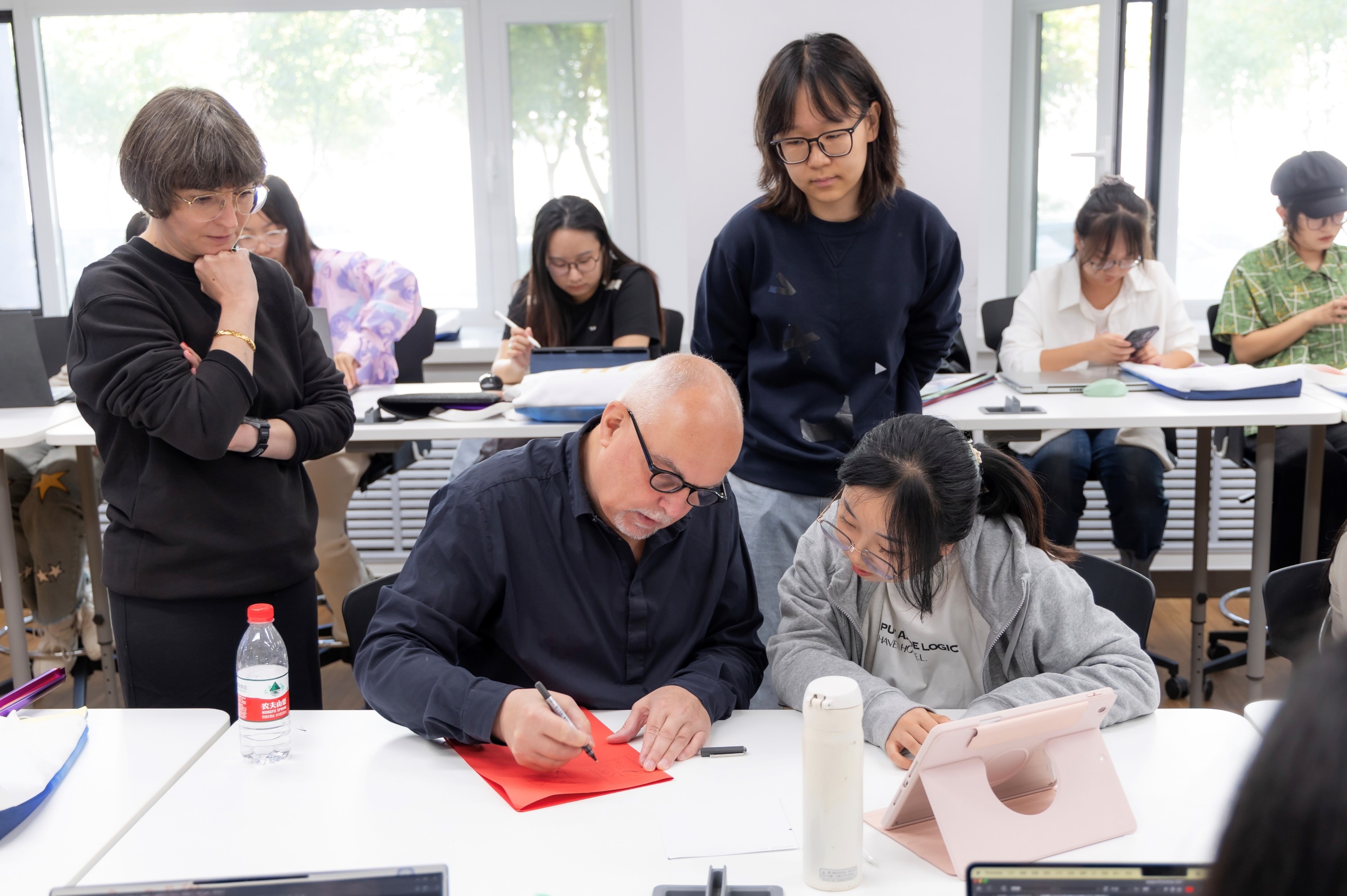 9月23日,Markus Weisbeck教授和Vera Kunz教授让同学们根据大家的作品制作创意海报,并配以标题和广告语。Markus Weisbeck教授和Vera Kunz教授逐一观看了同学们的海报作品,并耐心地指导同学们进行修改完善。最后,Markus Weisbeck教授和Vera Kunz教授为与同学们共同度过美好的三天而表示感谢。创意工作坊全体老师和同学们合影留念,为此次活动画上了圆满的句号。