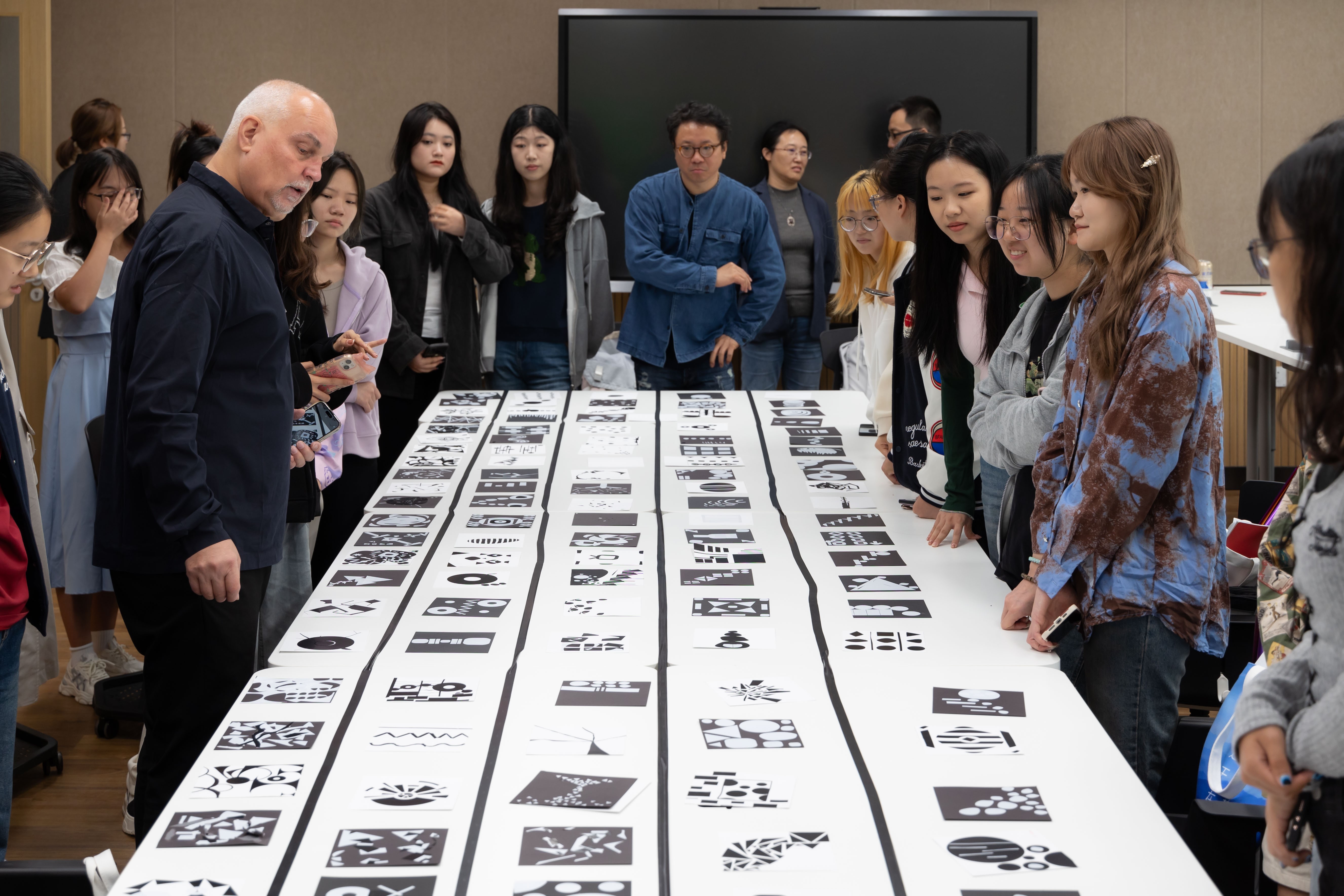 广告文化研究中心副主任王博学对两位教授的到来表示热烈欢迎,并简单介绍了两位教授的研究领域与创意工作坊的内容安排。Markus Weisbeck教授和Vera Kunz教授围绕工作坊主题,介绍了以往举办工作坊活动的经验,并希望同学们能够放松学习状态,在为期3天的工作坊里做到最好。Markus Weisbeck教授和Vera Kunz教授表示,大家应该在3天的创意活动中收获“意外的发现”。创意工作坊的第一个环节是让同学们发挥想象力,利用黑色与白色的卡片和贴纸表达对5个词语的感受。同学们创作热情积极高涨,完成了一件件出色的作品。