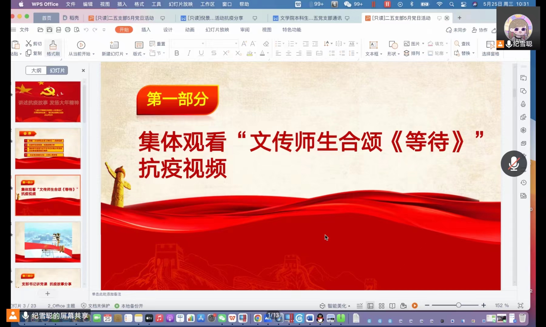 本科生第二、第五党支部于2022年5月25日上午10:30在腾讯会议开展“讲述抗疫故事,发扬大年精神”主题党日活动。会议由第二党支部书记曲昭琦和第五党支部书记王振彰组织召开,支部全体党员、2022年第一期新闻与传播学院发展对象参加会议。