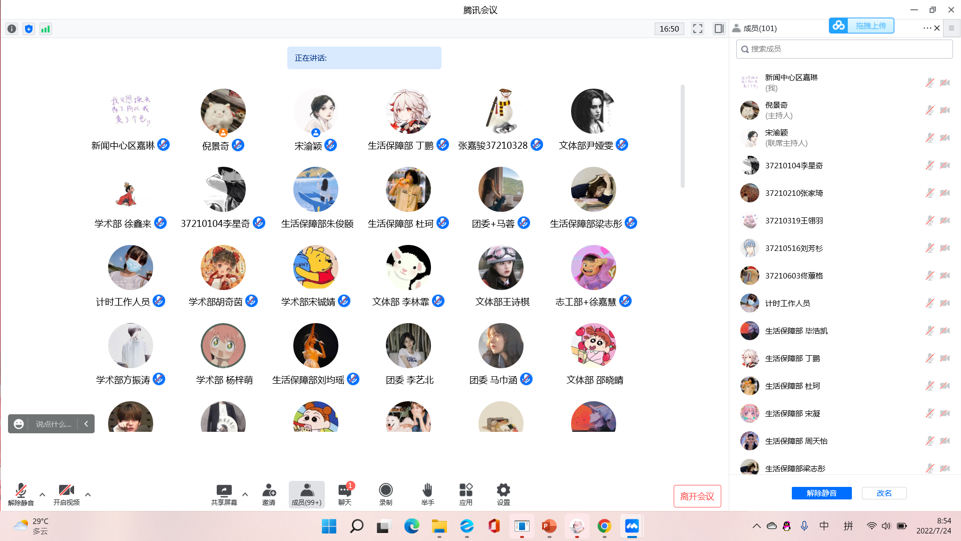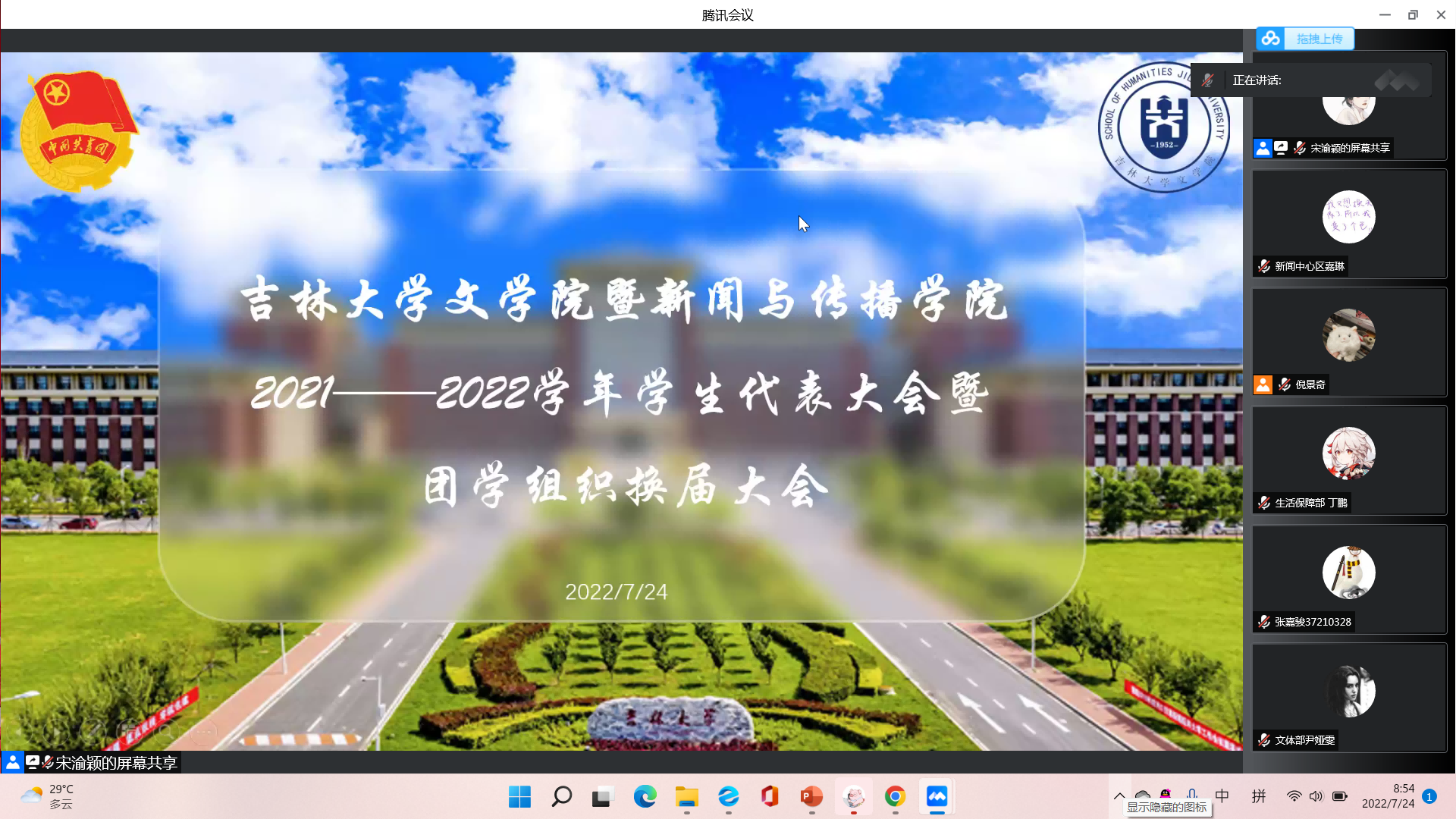 暨新闻与传播学院于7月24日上午9时,通过腾讯会议召开2021-2022学年学生代表大会暨团学组织换届大会。此次大会由院学生会主席团共同主持,李芊满老师、于航老师、曲昭琦老师、王振彰老师、团学组织各部门负责人和100余名学生代表参会。
