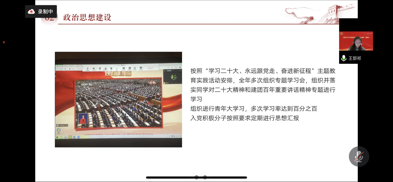 随后,2021级历史学专业团支书尹婷作了“征途漫漫,惟有奋斗”、“星火汇聚,璀璨前方”的主题发言。2021级广播电视编导专业团支书王郅祁作了“永远跟党走,奋进新征程”的主题分享。2020级人文科学试验班专业组织委员赵新毅作了“史韵明道继往圣,文质凌云展宏图”的主题演讲。2020级新闻传播学类专业团支书周思岐作了文采飞扬的主题解析。研究生第一团支部支书王月众、第三团支部支书李玲先后就对标定级工作进行了交流分享。上述六位同学的发言交流,紧扣团支部对标定级的五个维度展开,主题突出,特色鲜明,图文并茂,既看到了所在团支部取得的成绩,又发现了其存在的问题,更指出了其前进的方向。