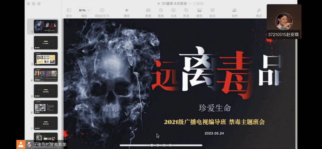 2023年5月25日,为向同学们宣传禁毒知识,加强防范意识,2021级新闻学专业通过腾讯会议线上召开了5月班会活动。班主任张斯琦老师、全体同学皆准时入会,班长王皓同学主持会议流程,大致介绍了本次活动的主要内容,活动顺利展开。会议首个环节中班会上,班长结合学生实际,通过组织观看防毒禁毒视频、图片、播放PPT等多种形式对毒品进行了讲解和宣传,让同学们了解了毒品的危害、如何识别吸毒人员、如何抵御毒品的侵害、涉毒违法犯罪的法律责任等知识,让学生明白了“吸毒一口,掉入虎口”的道理。紧接着,通过影片放映的方式向大家展现了禁毒民警们长久以来为禁毒工作做出的努力和牺牲。视频中,即使缉毒警察们不能表露身份面容模糊,同学们依旧能从他们的讲述中感受到禁毒工作的艰难和危险,并为他们舍己为人、不惧牺牲的品质所感动,更深一步了解到毒品的危害性和禁毒工作的重要性。最后一个环节,通过我国云南边境等地区的真实案例讲解,让同学们真实感受到毒品对个人、对家庭的危害,积极引导大家提高识毒、防毒、拒毒意识以及对诱惑的警觉戒备心理,让禁毒宣传教育深入人心,筑牢同学们的反毒、禁毒思想防线,让毒品侵害无缝可钻。通过本次禁毒宣传教育,同学们的识毒、防毒、拒毒意识得到了很大的提高。同学们纷纷表示:要从自己做起,从现在做起,树立正确的人生观,时刻记住,珍爱生命,远离毒品!齐心协力,共同铸成一条防毒的坚实长城,挡住毒品流入我们生活中的每一个缝隙!