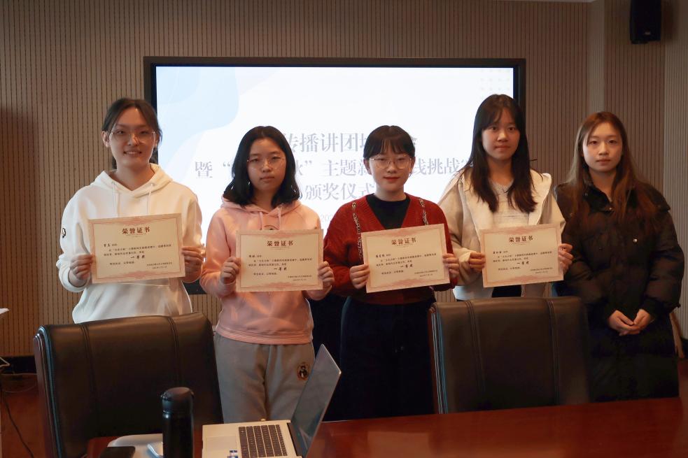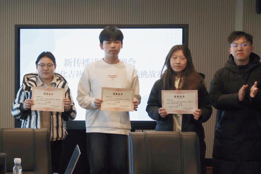 会议第二项,以“文化吉秋”主题新闻实践挑战赛颁奖礼作为本轮寒假班培训的结课总结。本次实践挑战赛中,谢航、潘星儒、贾真、果欣然获得一等奖;吴思莹、刘奕麟、张雨悠、李雨航、李禹茜、赖奕霏获得二等奖;沈之皓、徐聪、钟康茵、胡梦竹、赵恩琪、李茗萱、张予馨获得三等奖。4K影视主任闫梓锋和刘晨欣为获奖同学颁奖,闫梓锋总结了寒假班培训的内容和以赛促学的实效,点评了参赛学生的亮点作品,对获奖同学表示祝贺与鼓励,真切希望各位学生记者能在新学期以更加积极的态度参与到新闻实践中去。