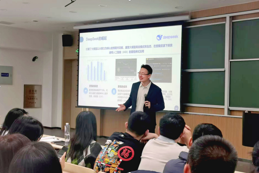 在专题讲座中,徐昊老师从人工智能技术的诞生出发,系统梳理了AI技术的演进脉络,解析了DeepSeek大模型的技术突破与运行原理。他提到,“DeepSeek的成功研发标志着人工智能技术正加速融入日常生活”,强调AI对当前知识生产方式的重塑。同时阐明消除公众认知偏差的必要性,指出直观认识人工智能技术的紧迫性,激发学生探究人工智能领域的学习热情。