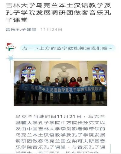 11月21日,李剑影老师及团队应邀赴柴可夫斯基音乐学院进行音乐孔子课堂现状的考察,与音乐孔子课堂外方院长维克多·邦达楚克、执行院长李情展开交流研讨,分享彼此的中国文化海外传播经验,并计划在未来开展多项合作。柴可夫斯基音乐学院和国内合作院校——中央音乐学院的微信公众平台对此次考察进行了相关报道。柴可夫斯基音乐学院孔子课堂是欧洲境内首个“音乐孔子课堂”,先后在“中乌友谊音乐会盛典”“中乌音乐对话”“中国音乐进校园”“孔院发展研讨会”等活动中展示传播中国音乐文化,受到乌克兰民众的热烈欢迎。