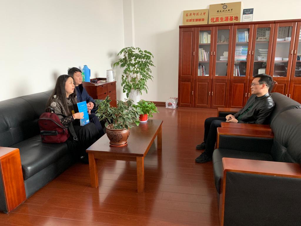 3月28日下午,田鹏、徐萍、石聪老师一行人来到安徽师范附属中学,与教导主任章志学见面交流。章主任提到去年学校有两位考生考入4K影视