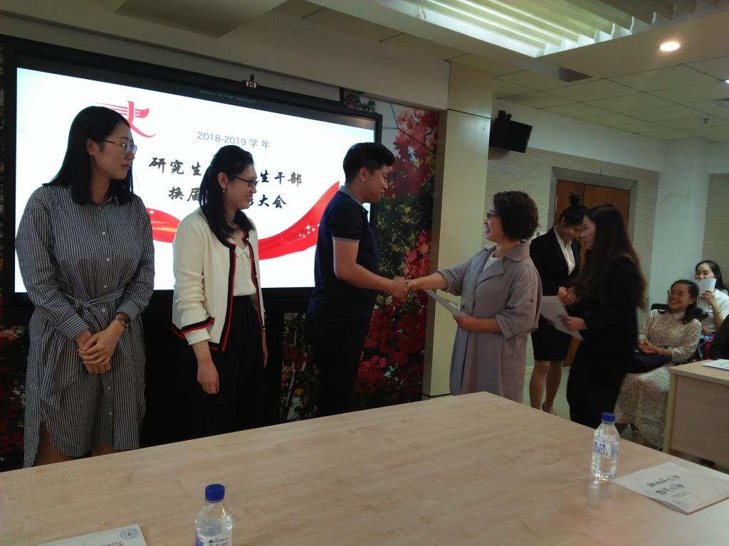 随后,研团委副书记董世盐、研会主席董玮佳分别代表2017-2018学年研究生团委和研究生会的做了工作汇报。详细介绍了上一届研究生团学工作进展情况,并对新一届研究生团学工作提出了诸多期望。面对老师和师兄师姐的谆谆厚望,新一届研团委副书记才宛冬、研会主席曲盛妍分别代表研团委及研会做了2018-2019学年团学工作展望,并表示新一届研究生团学组织成员必将牢记使命,坚决履行“为广大研究生服务”的神圣义务,不辜负老师和同学们的信任。