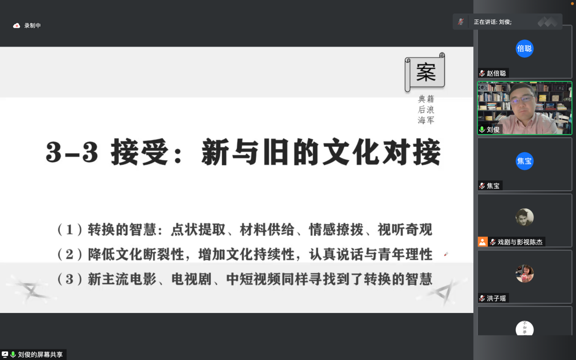 暨新闻与传播学院、“新闻传播+”研究生学科交叉融合学术交流分中心以线上讲座的形式,特邀中国传媒大学教授、博士生导师刘俊。以“数字时代传媒艺术创作、传播与接受的三个趋势”为题,为各专业研究生进行了深入讲解,推动了各学科间的相互交流。新闻与传播学院焦宝老师、姜明老师参与本次讲座。新闻传播学、马克思主义理论、文学、史学、管理学、考古学等专业同学聆听本次讲座。