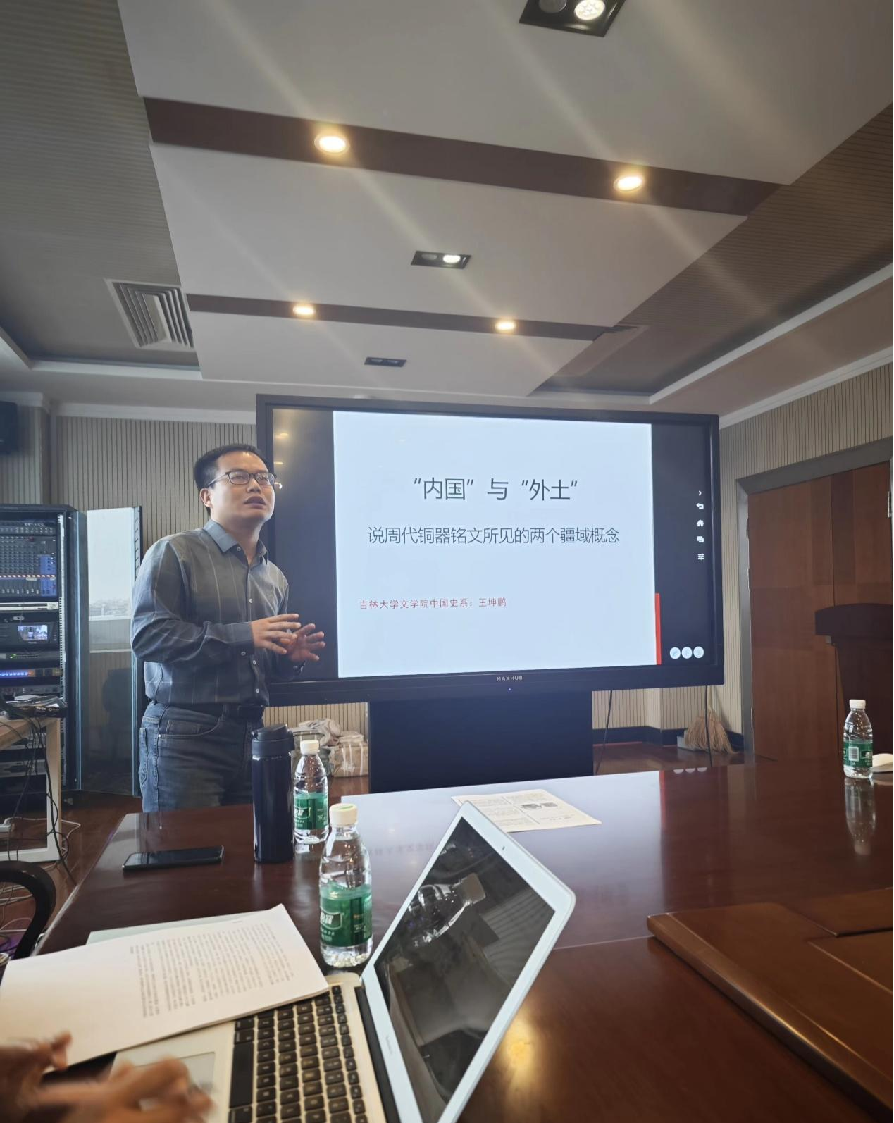 “励新优秀青年教师”培养计划入选者、中国史系王坤鹏副教授作了题为“‘内国’与‘外土’——说周代铜器铭文所见的两个疆域概念”的学术报告。在报告中,王坤鹏副教授从周代青铜器彔卣与戎生编钟铭文中出现的“内国”与“外土”这两个概念出发,仔细辨析了概念产生的政治与社会背景,深入讨论了其具体内涵,并进一步谈到周代国家的疆域形态与疆域观念等重要问题。在评议与讨论环节,李佳教授指出,报告结合青铜器铭文,针对西周国家的疆域问题提出了新观点,对其他断代问题也有一定的启发。陶莎副教授指出,报告题目涉及早期中国历史地理问题,对“土”等概念的探析比较深入,也有助于五服制等问题的探讨。吴翔宇老师指出,报告所选取的史料集中在西周中期,主要涉及军事方面,仍存在进一步扩充的空间,辽金史研究中也有相似的研究课题可以借鉴。