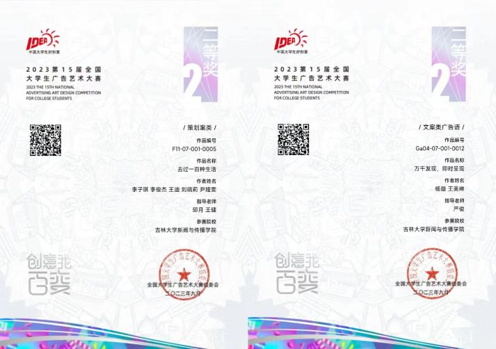 暨新闻与传播学院共获得国家二等奖2项,分别为由邱月、王健老师共同指导,学生李子琪、李俊杰、王迪、刘晓莉、尹娅雯共同完成的策划案作品《去过一百种生活》,以及由严俊老师指导,学生杨璇、王美琳共同完成的广告文案作品《万千发现,即时呈现》。另获得国家三等奖3项,国家优秀奖10项。