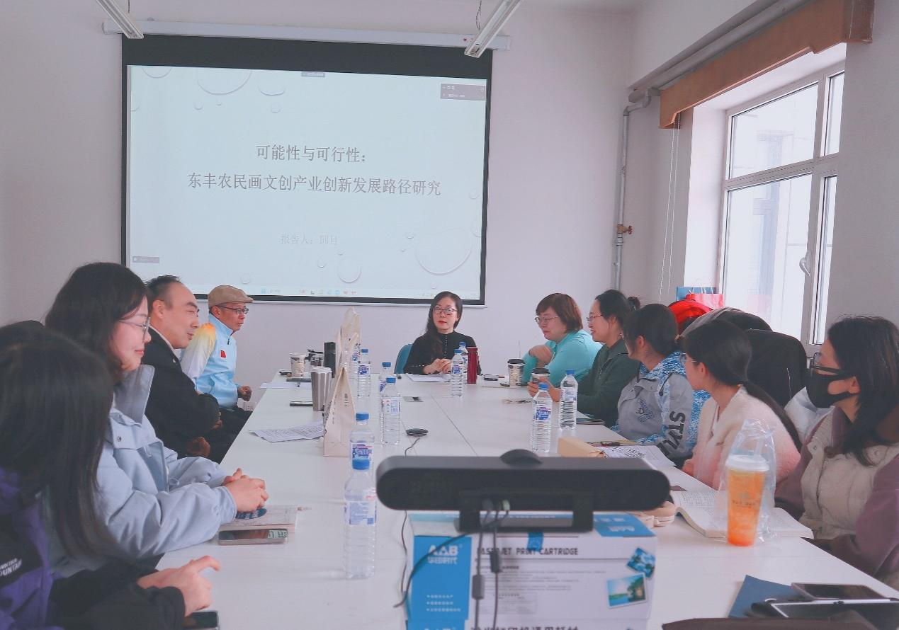 在评议与讨论环节中,王健副教授认为,报告从如何更好地开发民俗文化资源角度出发,提出农民画文创产业创新传播策略,针对东丰农民画产业化问题进行的探讨,对于践行当下乡村振兴的时代命题有着强烈的现实意义。邱月副教授进一步补充了农民画的国际化、特色化问题,农民画以画为媒,能够实现“讲好中国故事”,起到跨文化传播的作用。许多澍副教授认为,品牌化、产业化对农民画文创发展具有重要意义,邱月副教授的研究具有示范性意义。王志成副教授提出以专属超级符号为东丰农民画赋能,提质产业化效能和进程。赵贺副教授提出应当关注创作群体的可持续性和可创作力。与会学生针对学术报告的内容积极提问,师生就文创产业创新发展的未来之路、东丰农民画当下的传播困境,例如产业化和个性化的矛盾、版权问题、资金支持等问题进行了热烈讨论,在思想碰撞中延伸出课题研究新的增长点。
