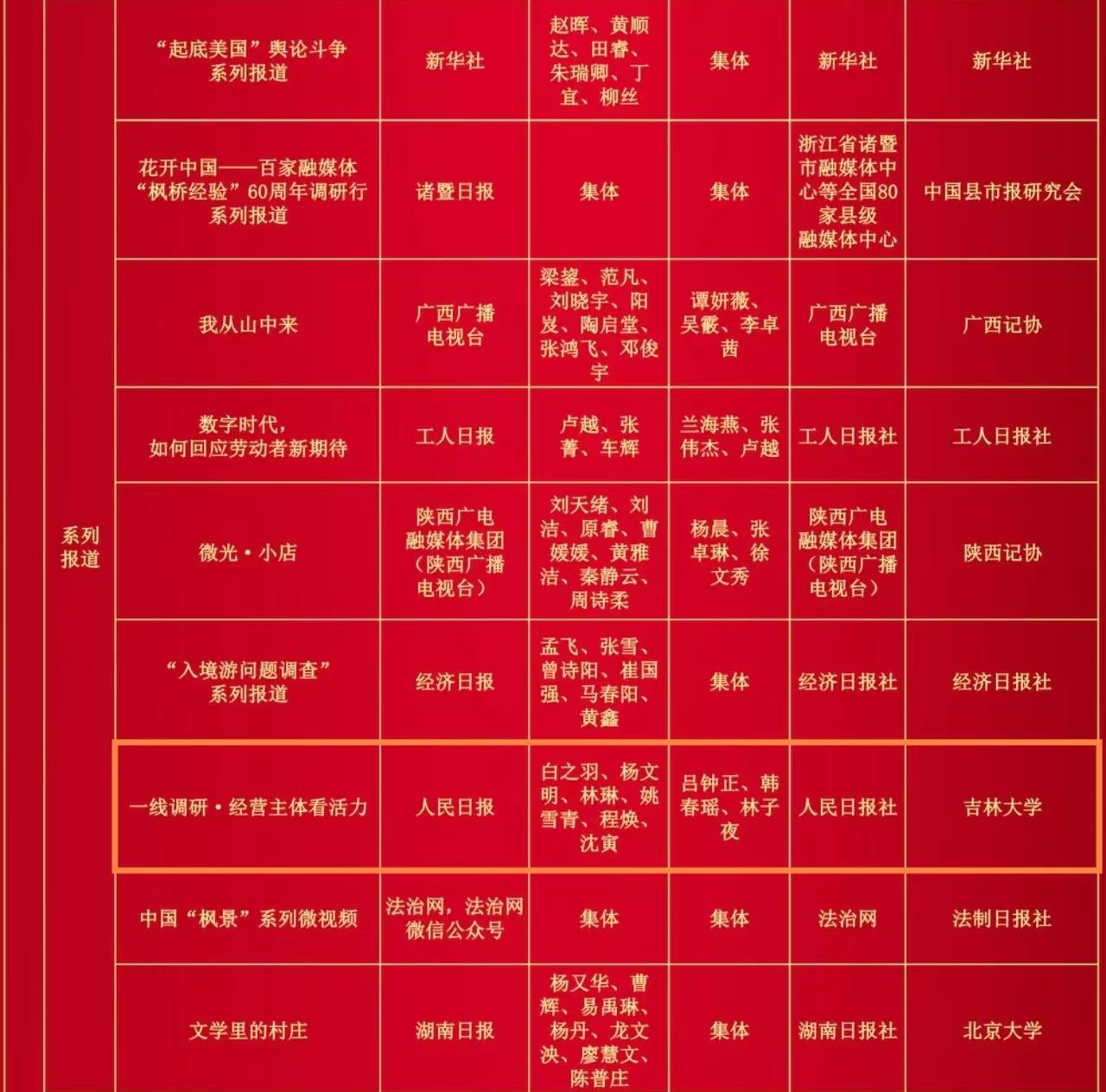 新闻与传播学院报送的2件作品:央广网的舆论监督报道《六问:河南南阳收割机为何无法下高速?》(作者:汪宁、余京津、刘保奇,编辑:张军、于锋、王薇)、人民日报的系列报道《一线调研·经营主体看活力》(作者:白之羽、杨文明、林琳、姚雪青、程焕、沈寅,编辑:吕钟正、韩春瑶、林子夜)双双获得第34届中国新闻奖二等奖。该院自2016年成为中国新闻奖试点报送单位以来,至今已有6件初评报送作品获得中国新闻奖。