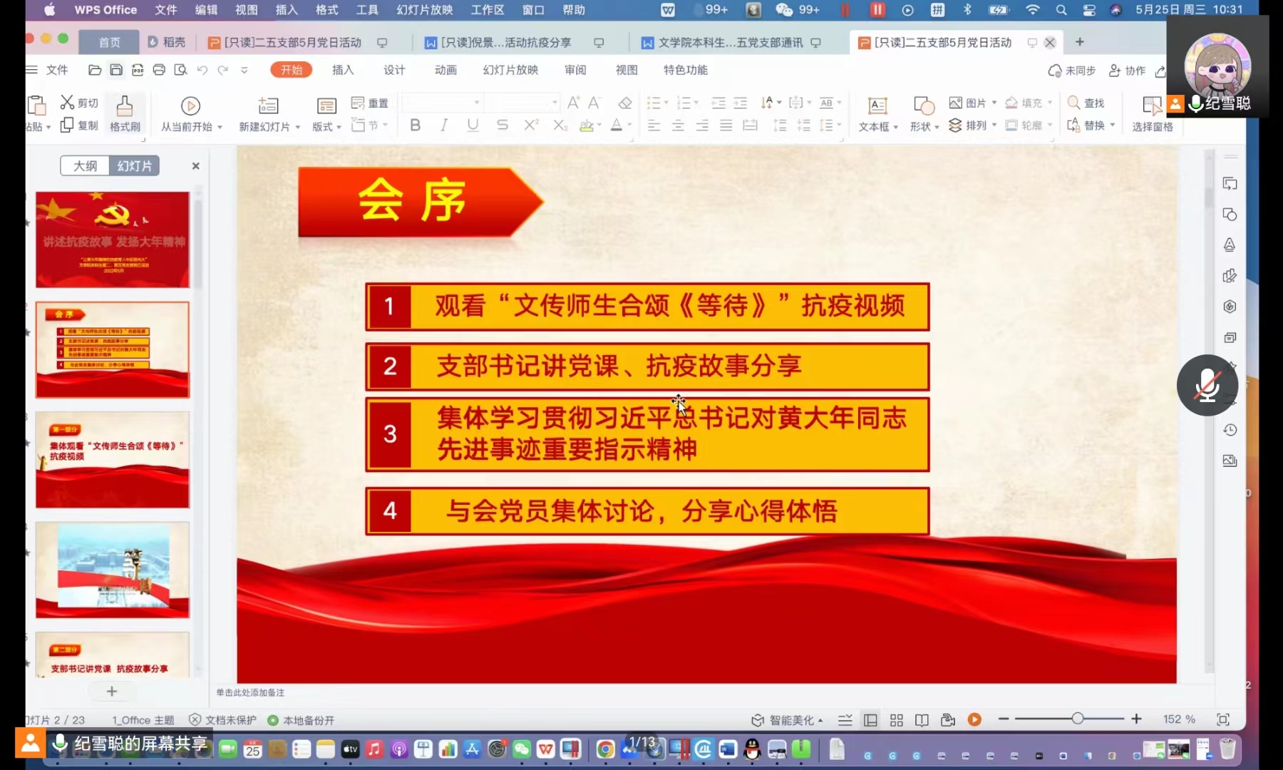 本科生第二、第五党支部于2022年5月25日上午10:30在腾讯会议开展“讲述抗疫故事,发扬大年精神”主题党日活动。会议由第二党支部书记曲昭琦和第五党支部书记王振彰组织召开,支部全体党员、2022年第一期新闻与传播学院发展对象参加会议。