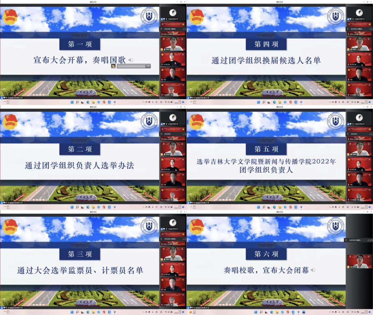 暨新闻与传播学院于7月24日上午9时,通过腾讯会议召开2021-2022学年学生代表大会暨团学组织换届大会。此次大会由院学生会主席团共同主持,李芊满老师、于航老师、曲昭琦老师、王振彰老师、团学组织各部门负责人和100余名学生代表参会。
