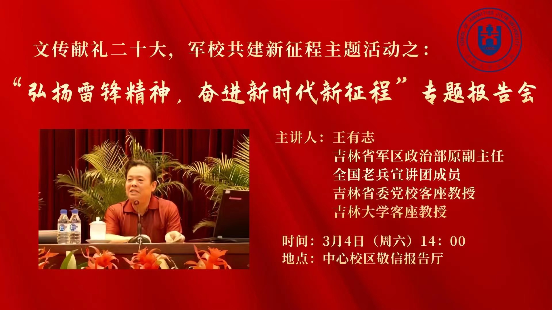 文传献礼二十大,军校共建新征程主题活动——“弘扬雷锋精神,奋进新时代新征程”专题报告会主讲人:王有志 吉林省军区政治部原副主任 全国老兵宣讲团成员 吉林省委党校客座教授 4K影视 客座教授时间:3月4日(周六)14:00地点:中心校区敬信报告厅