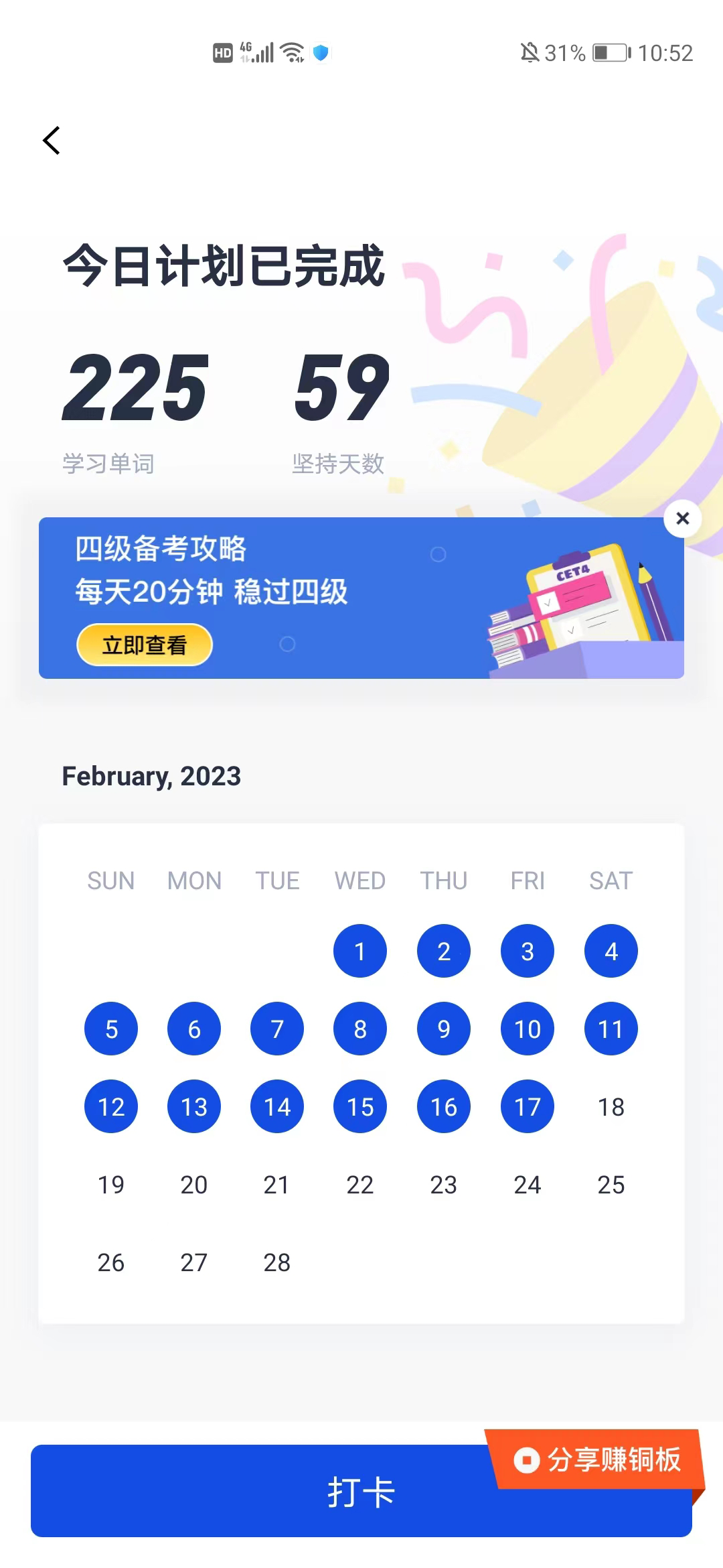 全体同学积极参与,来自各个学院的227位同学参与到学习打卡活动当中。活动取得了良好的成果,于2023年2月17日圆满落幕。