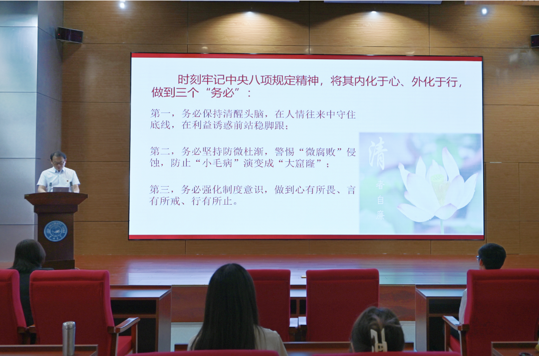 党委书记霍志刚在国际学术大讲堂为学院全体本科毕业生党员讲授毕业前“最后一次党课”。学院党委副书记兼副院长葛宗梅、本科毕业年级辅导员杨佳欣、全体毕业生党员参加。