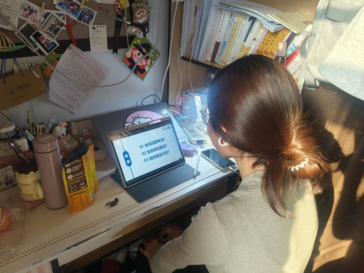最后的“行动心法”环节,王倩老师以“厚脸皮、勤手脚、细心思、强体魄”八字准则收束全场:“厚脸皮”是主动争取资源的勇气,“勤手脚”是落实计划的行动力,“细心思”是深耕内容的专注力,“强体魄”则是长期成长的基础保障。生动的表述让同学们快速理解明白行动要点,现场互动区频频弹出“实用”“清晰”的反馈。