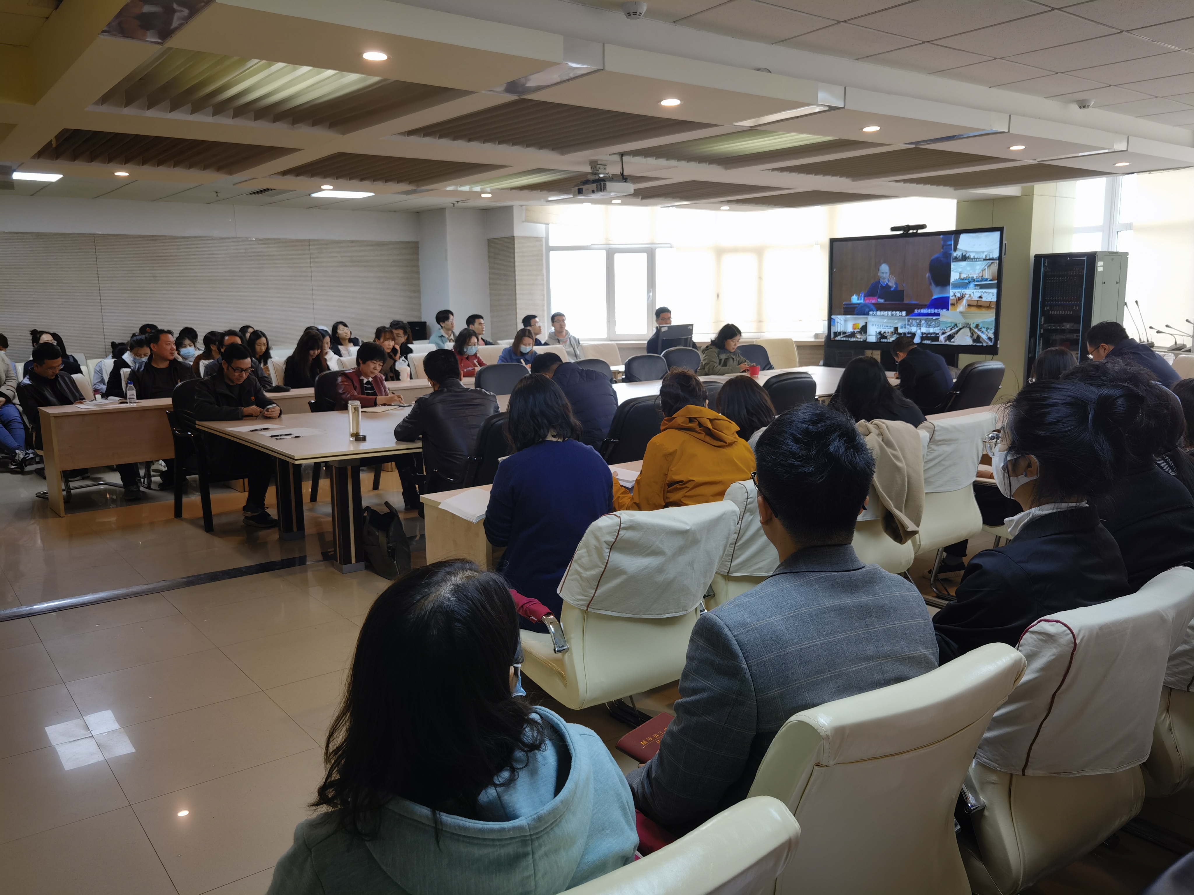 党委组织学院全体处级领导干部、党委委员、纪委委员、各系教工党员、学生党员代表于东荣十楼会议室在线观看视频直播,进行学习。