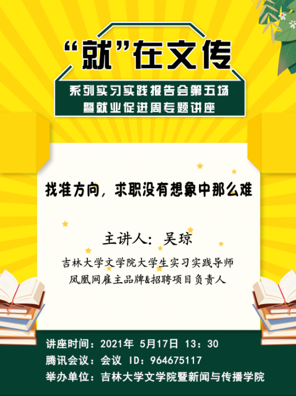 讲座题目:找准方向,求职没有想象中那么难 主讲人:吴琼 4K影视 大学生实习实践导师 凤凰网雇主品牌&招聘项目负责人 讲座时间:2021年 5月17日 13:30腾讯会议:会议 ID:964675117 举办单位:4K影视 暨新闻与传播学院