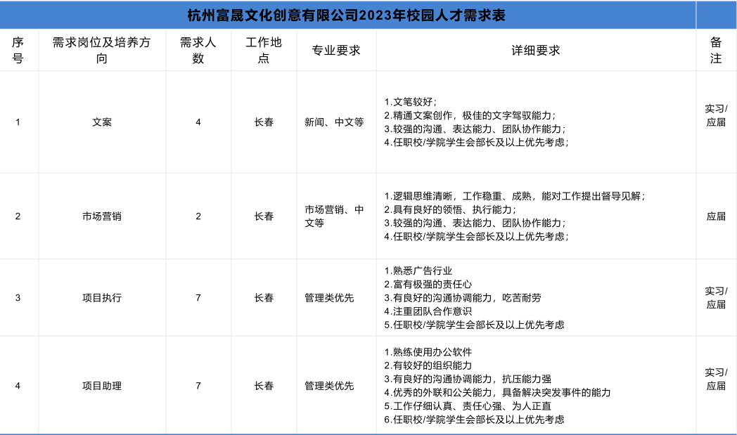 现将2023年富晟文化创意有限公司暑期实习招聘相关要求说明如下: